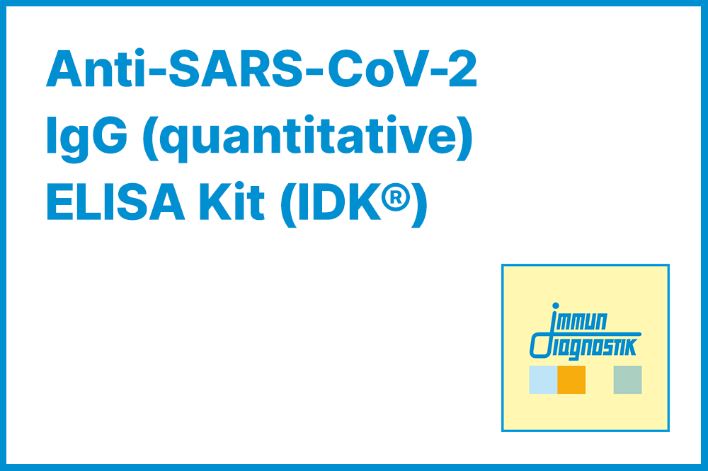The IDK anti-SARS-CoV-2 quantitative IgG ELISA is for the specific detection and quantification of human IgG antibodies against the SARS-CoV-2 spike protein, the results of which correlate well with the neutralising activity of the samples. In addition, this quantitative anti-SARS-CoV-2 IgG ELISA shows an excellent correlation with the first WHO standard material for anti-SARS-CoV-2 immunoglobulins (NIBSC code: 20/136).