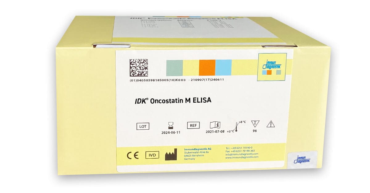 The IDK Oncostatin M (OSM) ELISA is used for the quantitative determination of oncostatin M in serum, plasma or stools. OSM and its receptor, OSMR, are involved in gut inflammation, and are upregulated in the mucosa of IBD patients. The amount of OSM in the gut mucosa can be a predictive biomarker of no response (primary non-response), and loss or response, to anti-TNFα treatment in IBD patients, and could be useful as a diagnostic tool for early stratification of patients to predict the efficacy of treatment.